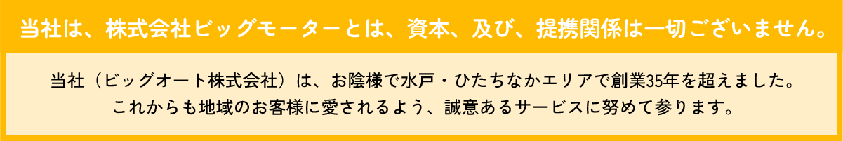 ※当社(ビッグオート株式会社)は、株式会社ビッグモーターとは一切の資本関係も提携関係もございません。お陰様で水戸・ひたちなかエリアで創業35年を超えました。これからも地域のお客様に愛されるよう、誠意あるサービスに努めて参ります。
